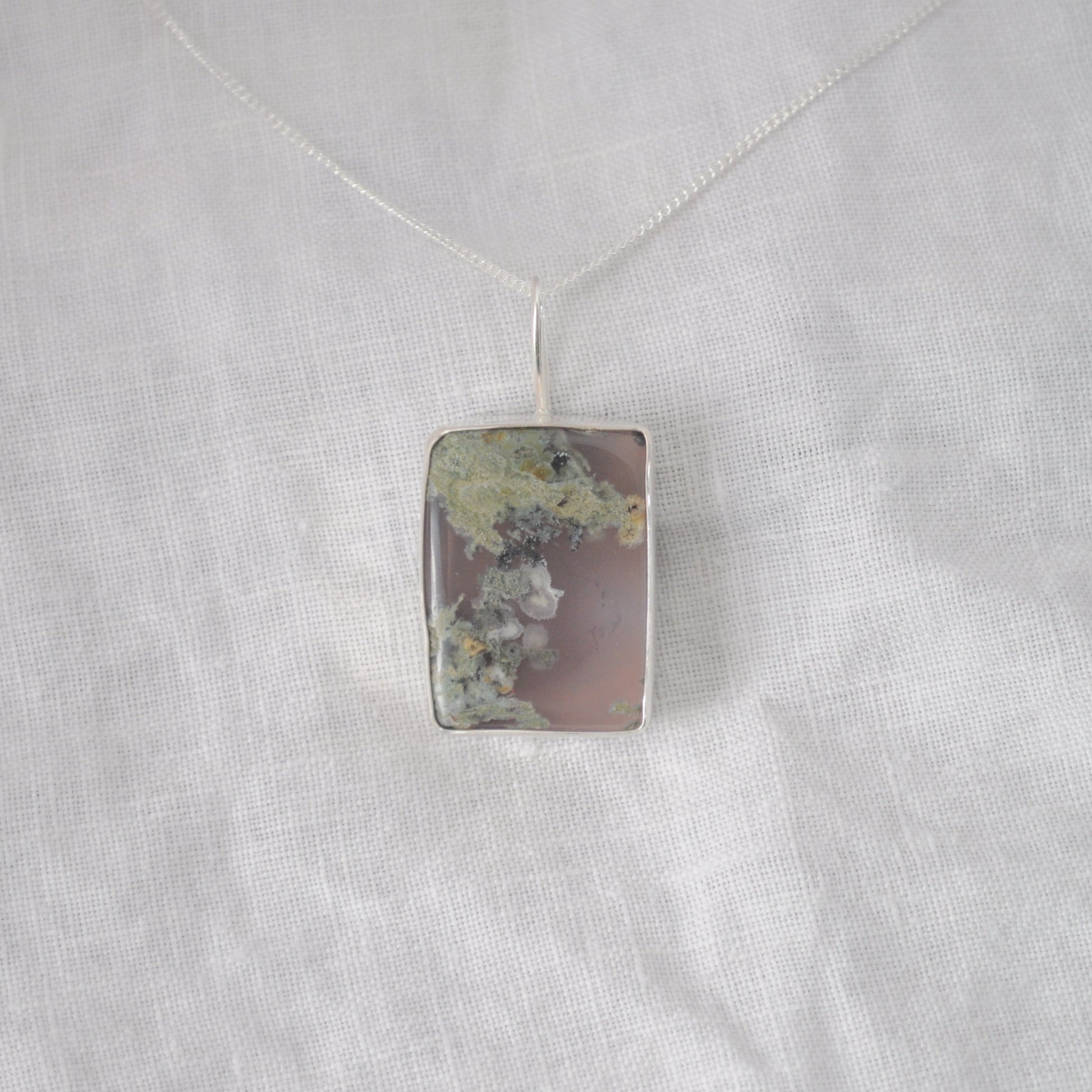 This moss agate chalcedony necklace sits on a 16-inch curb chain. This stone reminds me of an underwater coral scene with its beautiful green swirls and how the light hits the 'water'.