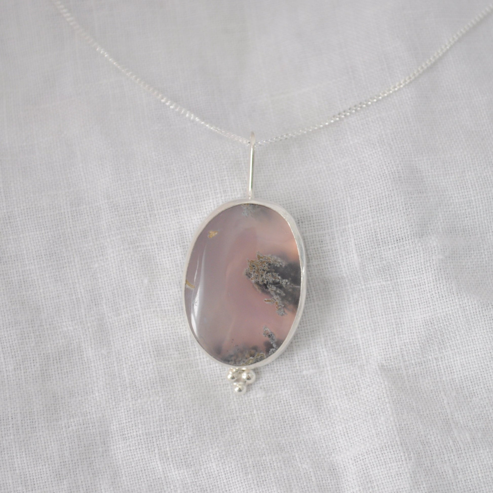 This moss agate chalcedony necklace with ball embellishments sits on a 16-inch curb chain and is reminiscent of coral in the ocean. The stone glows beautifully in the light.
