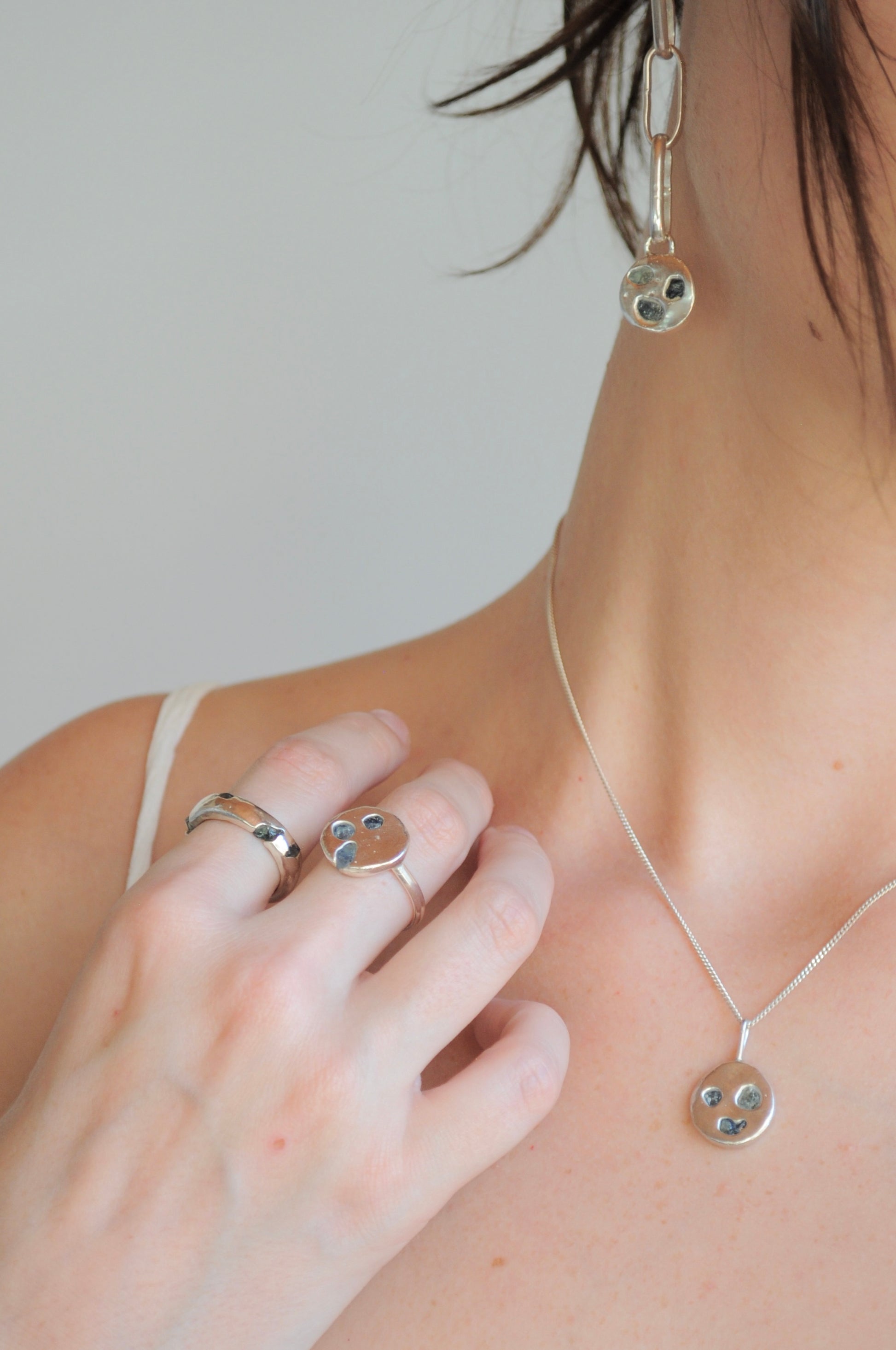 This size 6.5 sterling silver cigar ring features raw, natural sapphires.