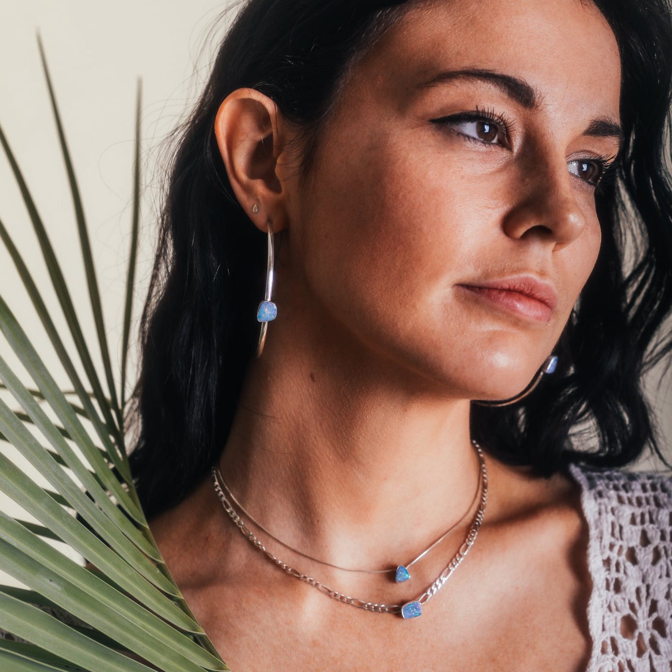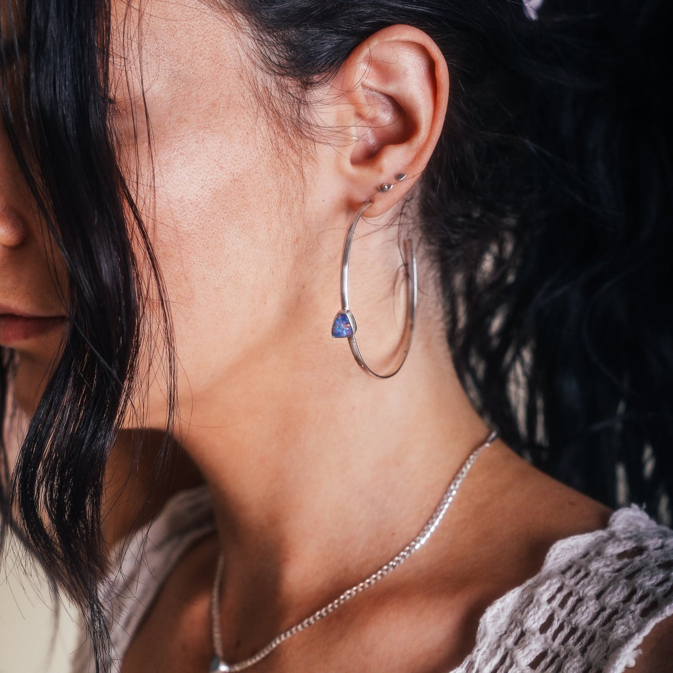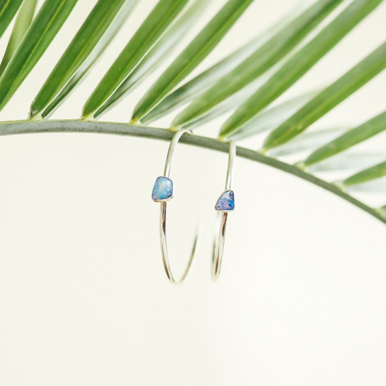 These earrings feature slightly mismatched Cobber Pedy opals that are floating on a large hoop. The hoops are 2.5 inches in diameter.