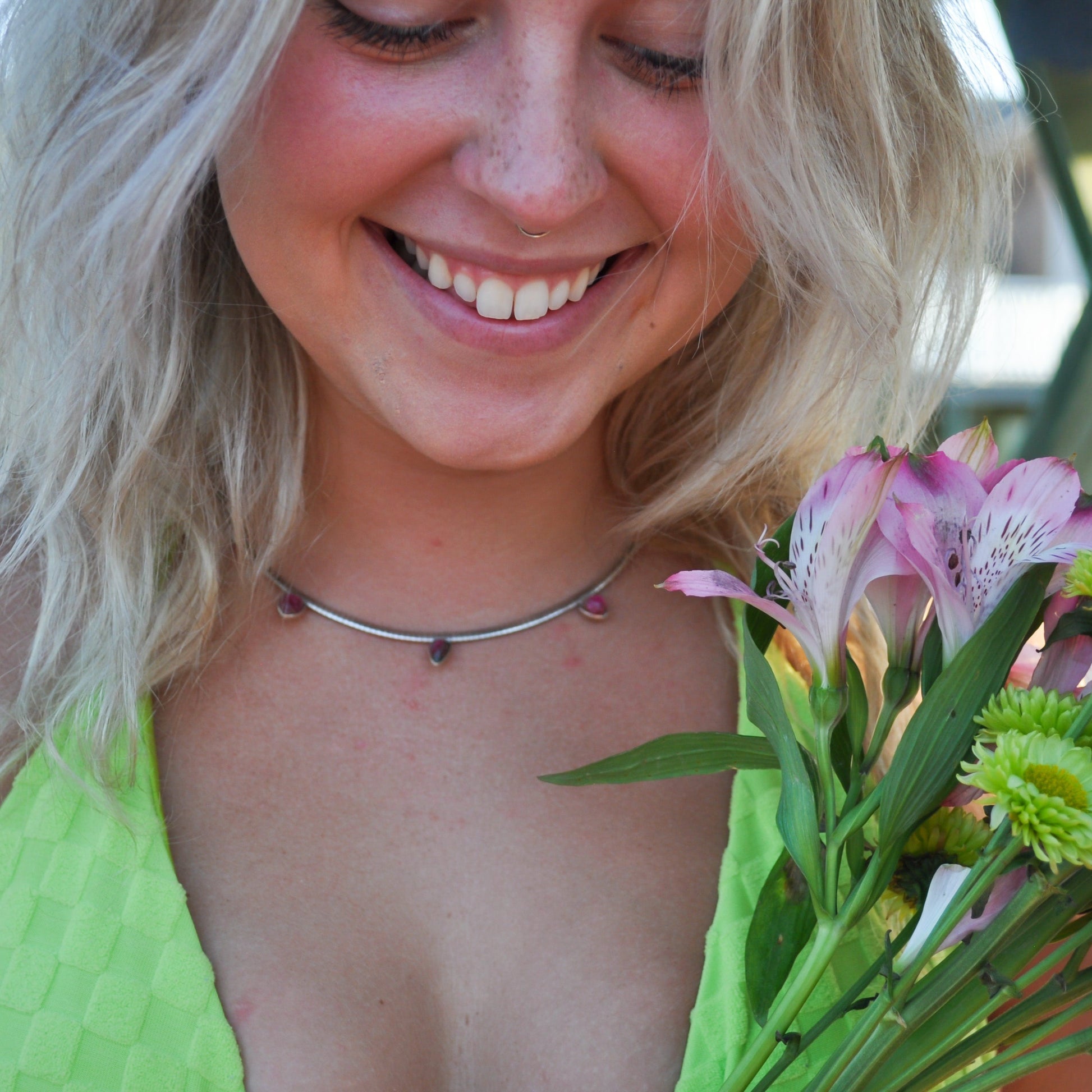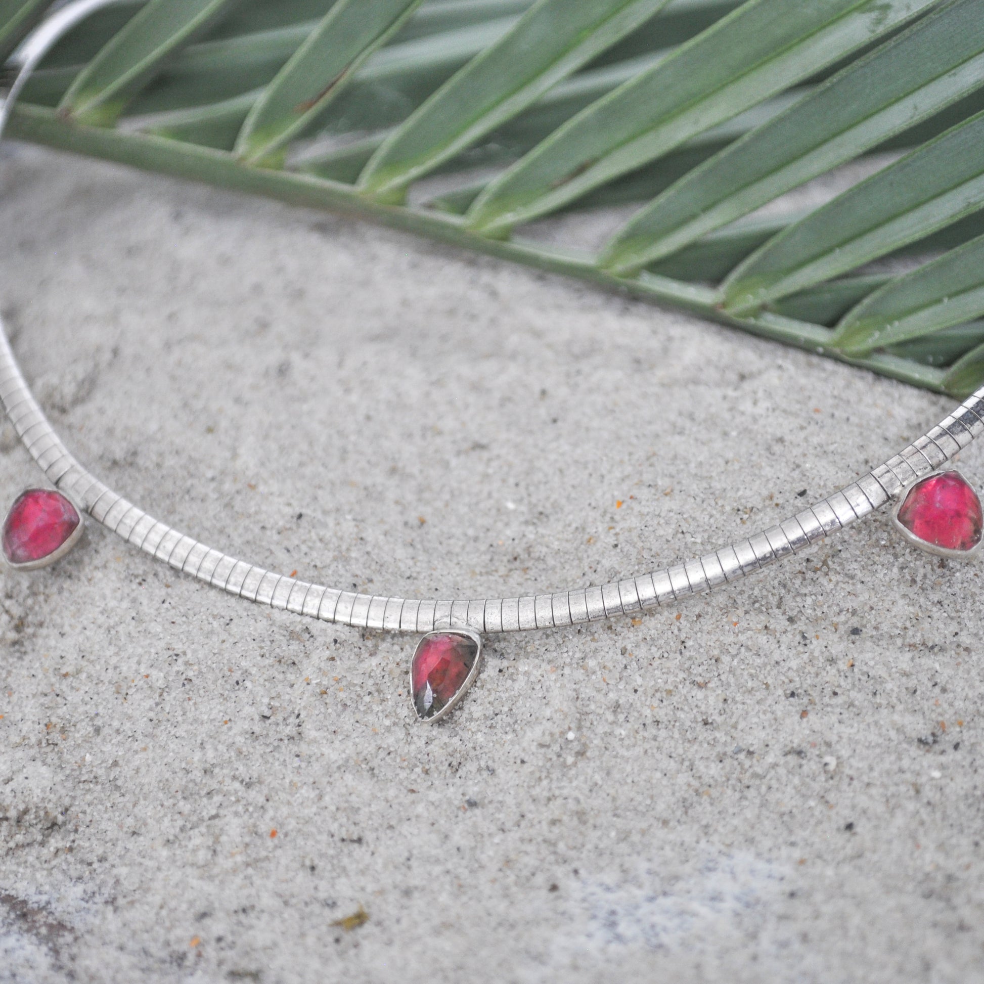 A 16-inch necklace on a vintage collarbone chain with three rose-cut watermelon tourmaline with various colors of pink and green.