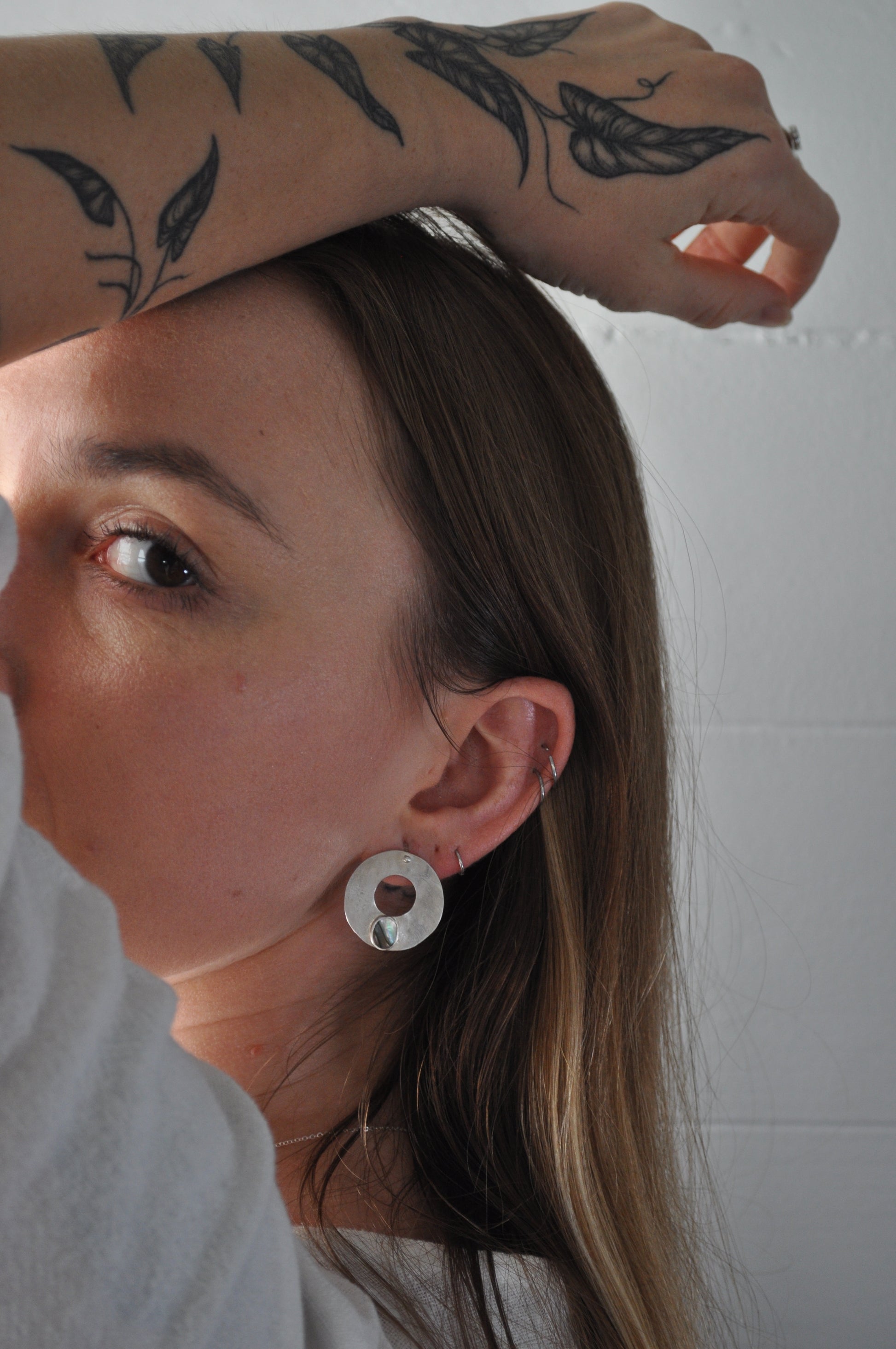 These earrings feature a hammered recycled silver disk with mismatched abalone shells.
