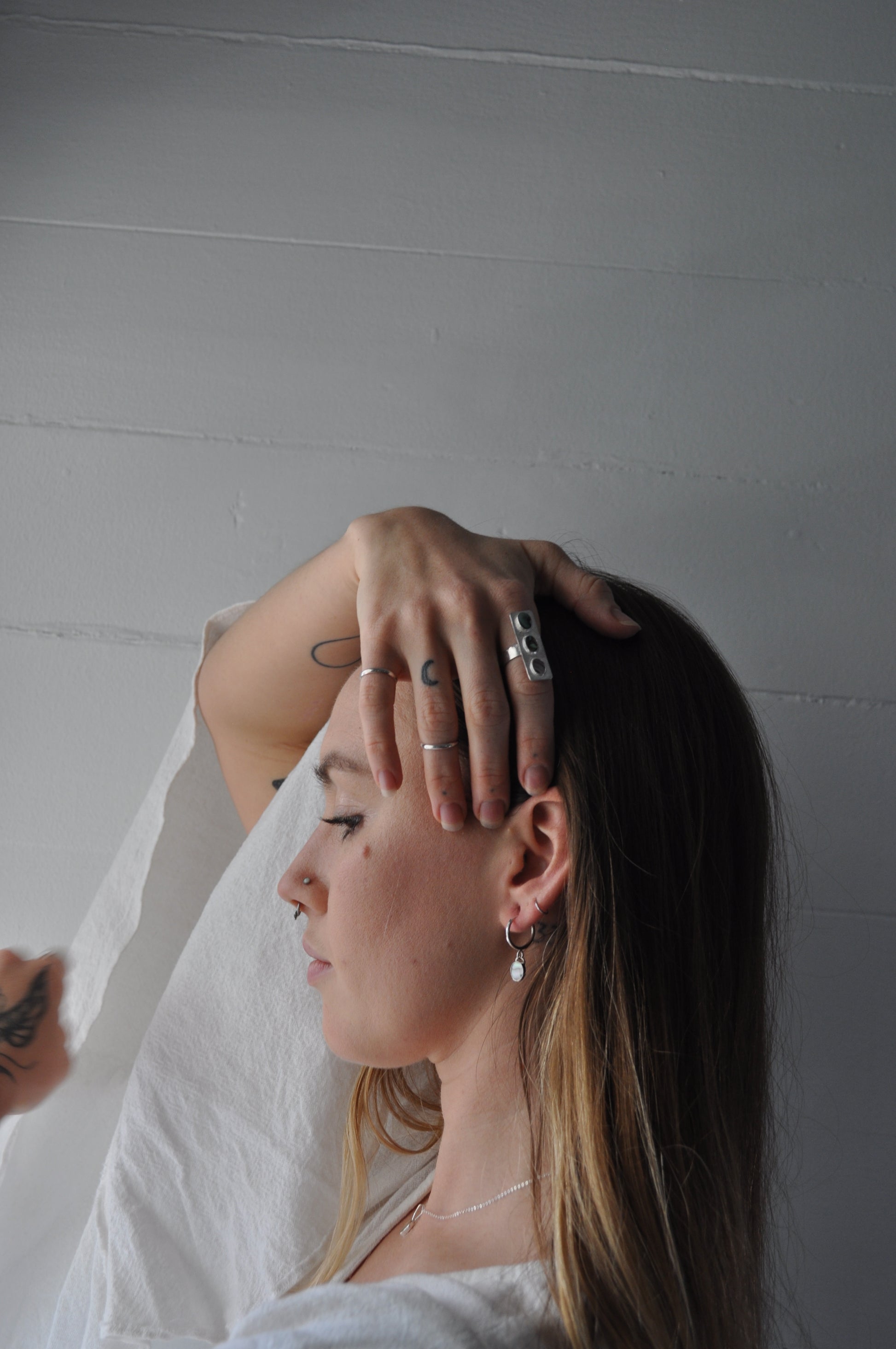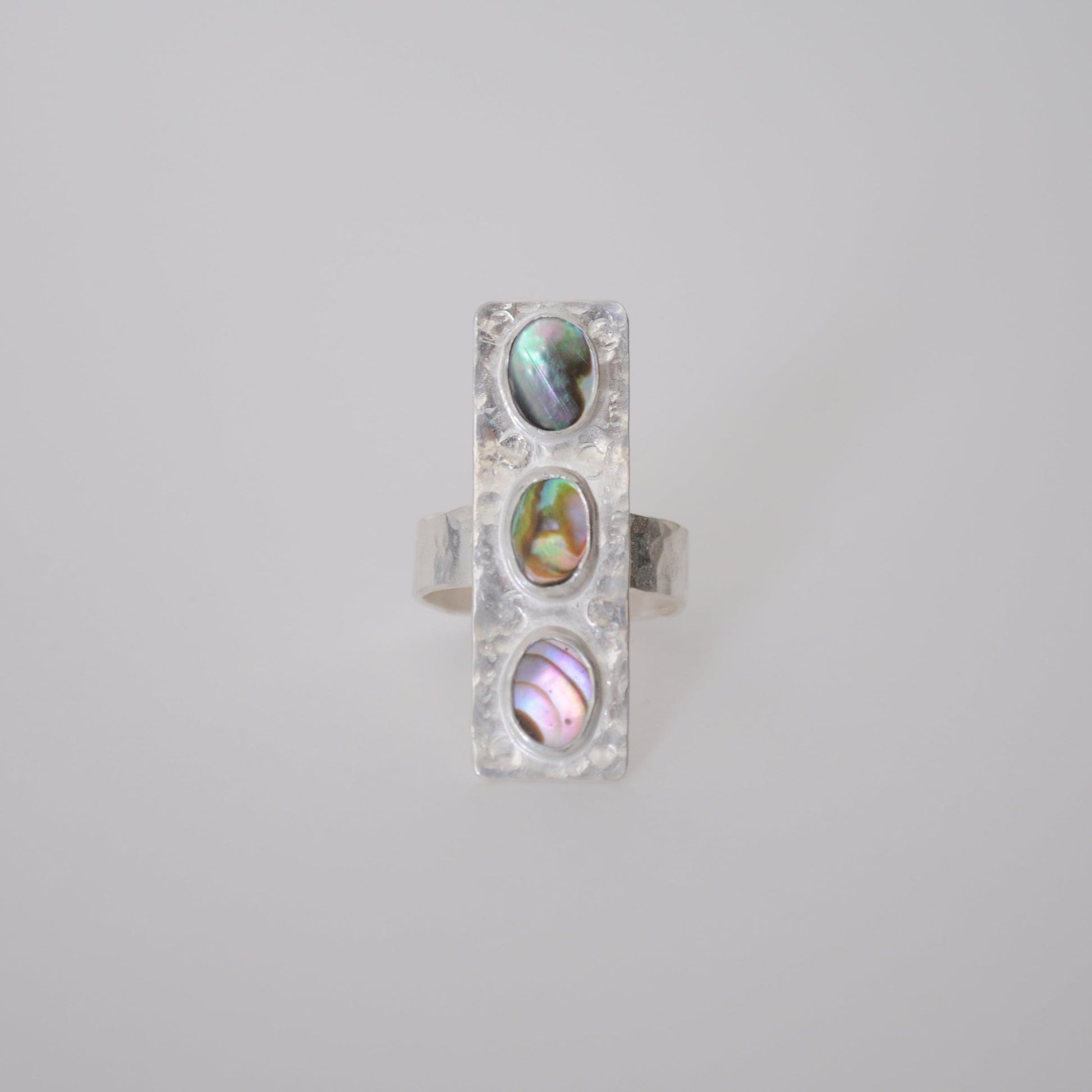This size 7 ring features a textured back plate with three gradient abalone shells and a textured ring band.