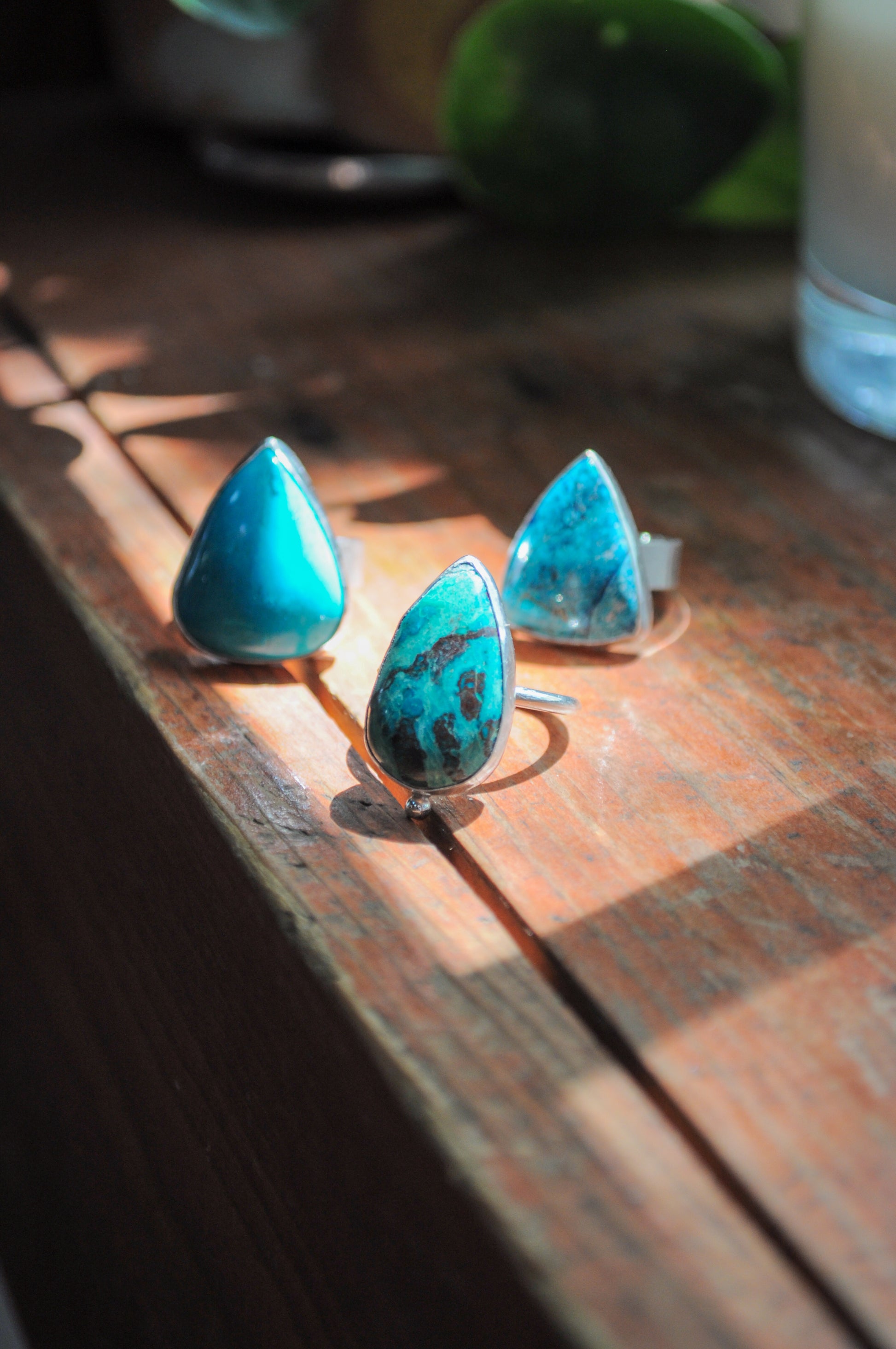 This size 7.5 ring features a round band and a circle embellishment at the bottom. This chrysocolla stone is teal with striations of brown throughout.