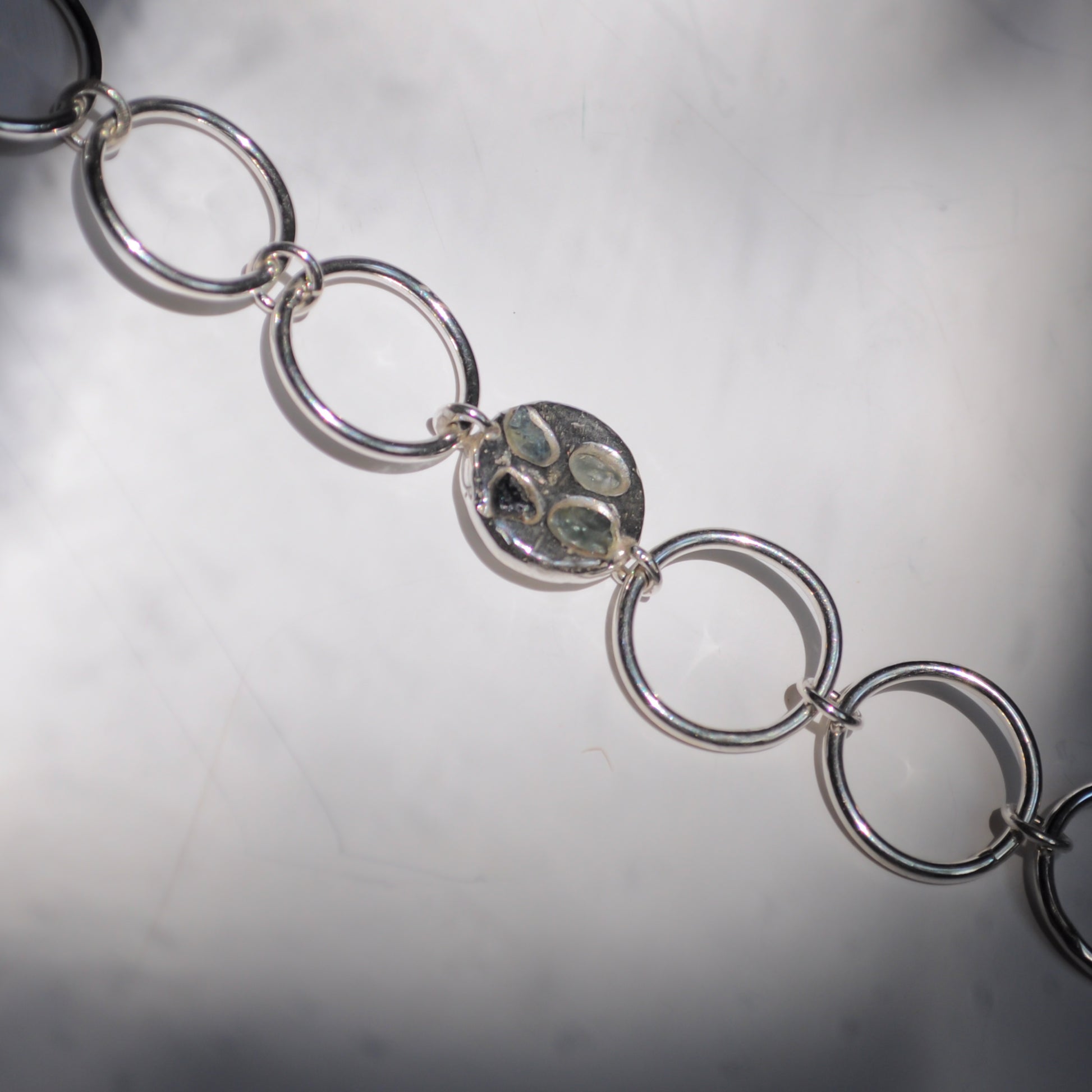 This sterling silver bracelet features a circle chain and raw, natural sapphires.
