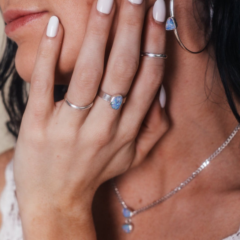 This ring features a 4mm cigar band with a freeform Cobber Pedy opal. The ring is a size 7.5 and features blue and green flashes with pink undertones.