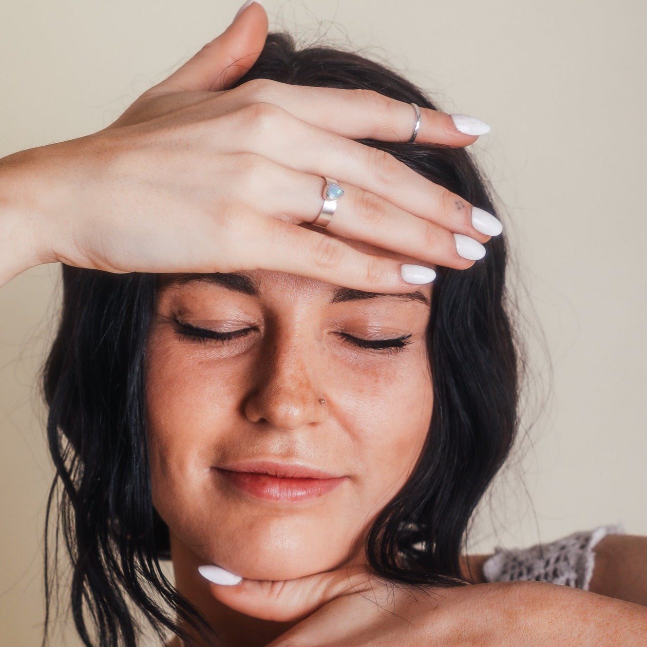This ring features a 5mm cigar band with a freeform Cobber Pedy opal. The ring is a size 7 and features coral and green flashes.