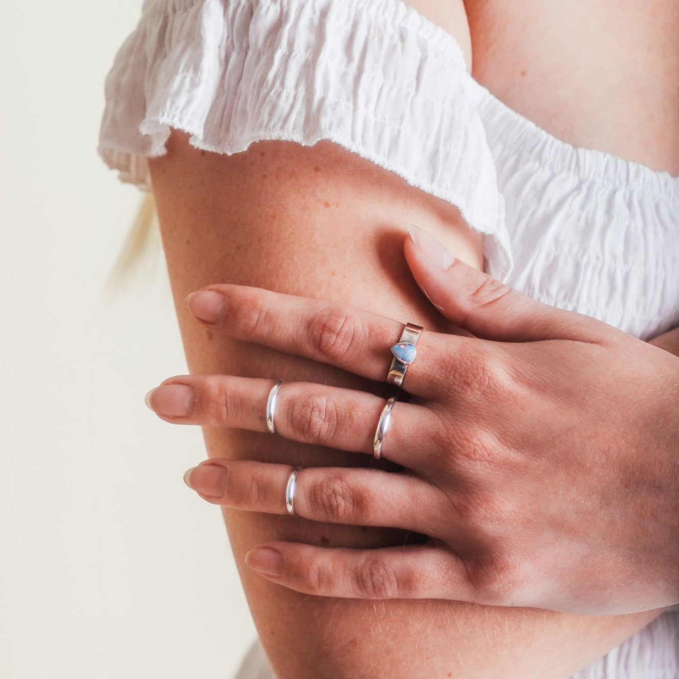 This ring features a 4.5 mm cigar band with a freeform Cobber Pedy opal. This ring is a size 6.5. One of my favorite stones in the collection because of the striations (or lines) in the opal. The stone has vibrant green flashes with hints of pink.
