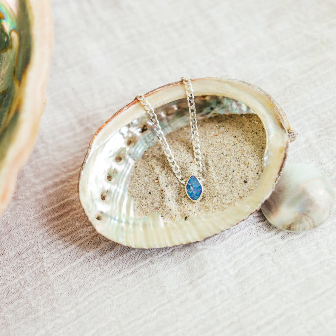 This necklace features a 16-inch dainty curb chain necklace and a freeform teardrop-like Cobber Pedy opal. This darker blue opal lets the vibrant blue, purple, green, pink, and orange flashes shine through.