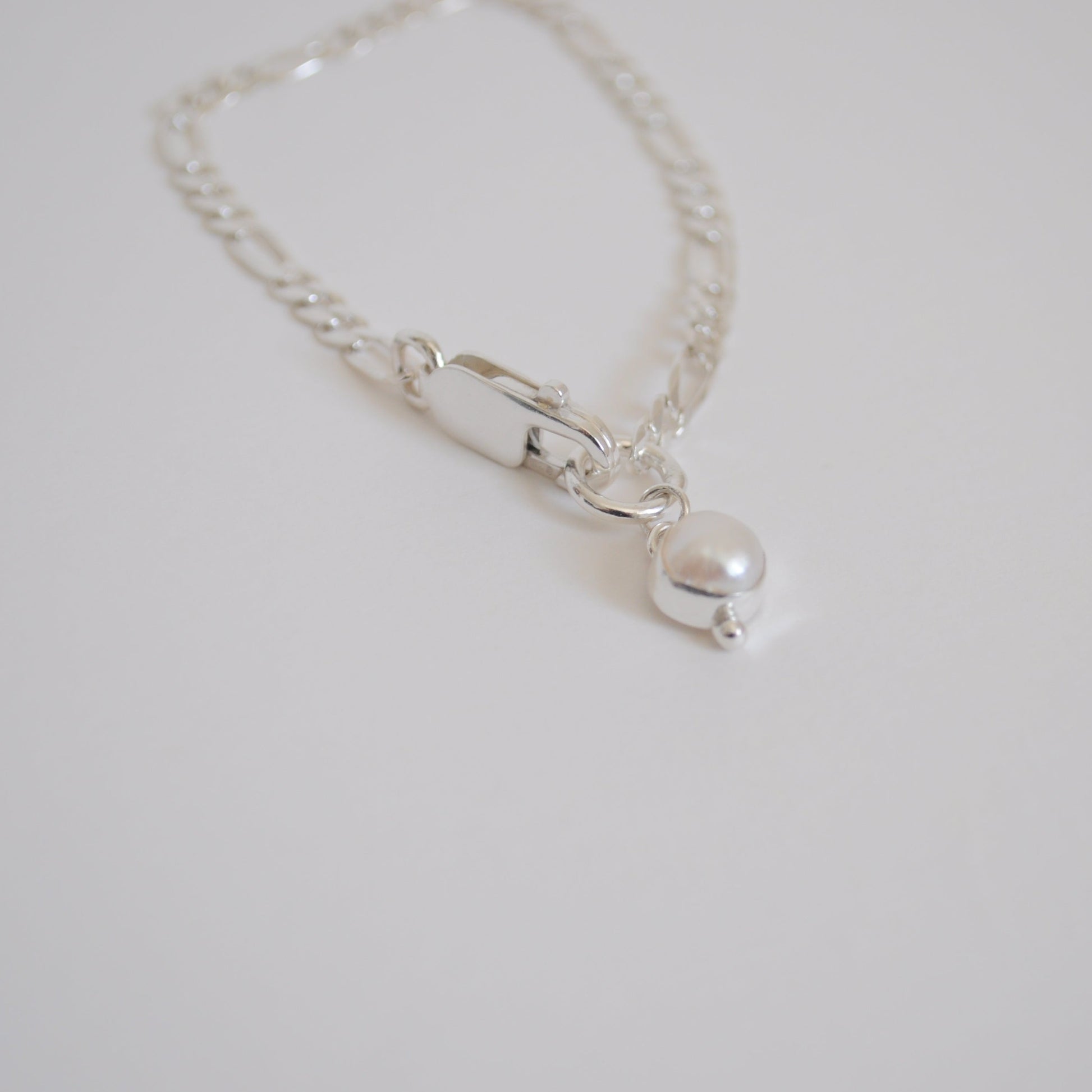 This size medium bracelet features an exaggerated closure and a dangly pearl.