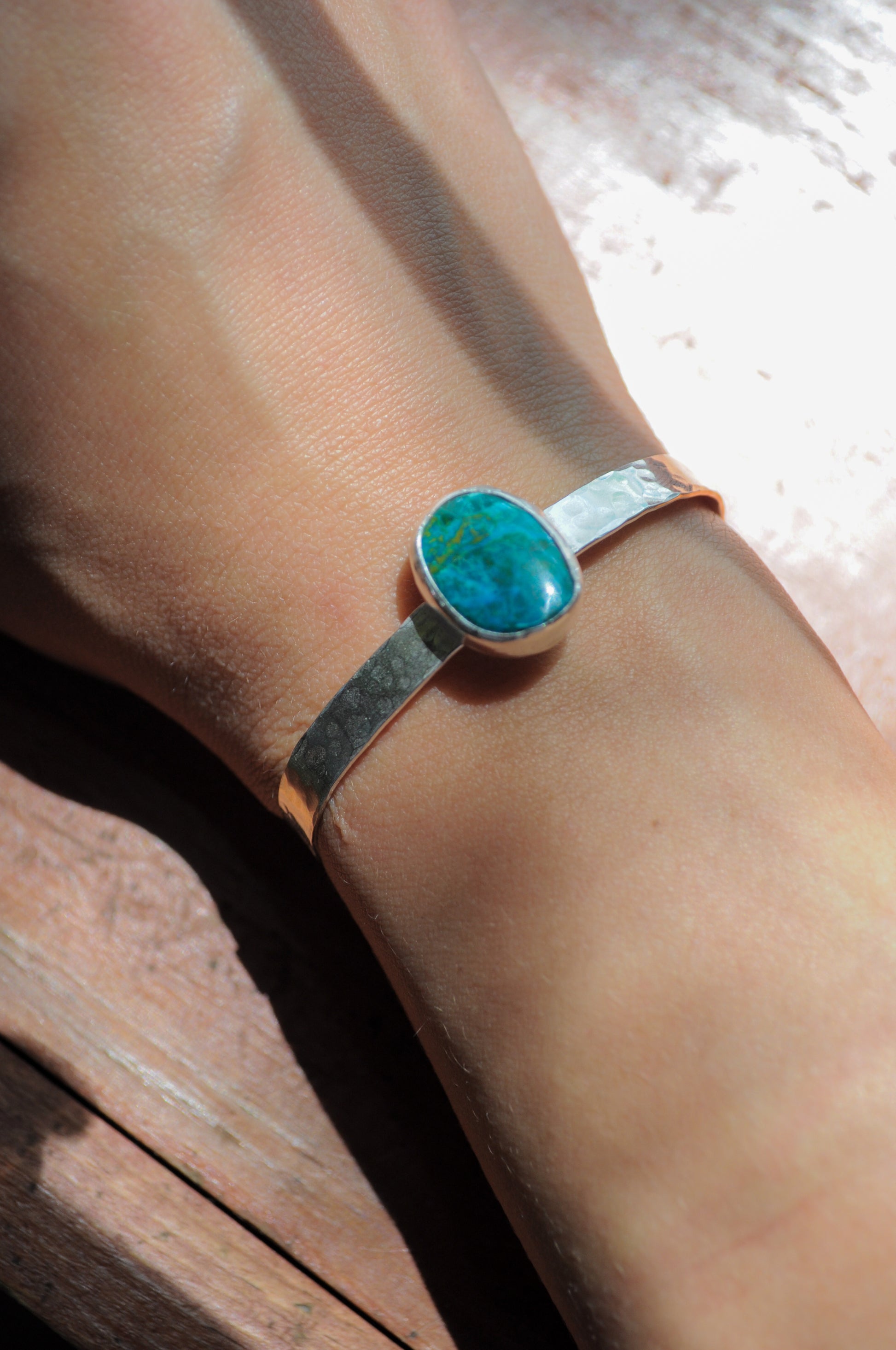 This size small open-bangle bracelet features a textured band with a dark-toned chrysocolla stone.