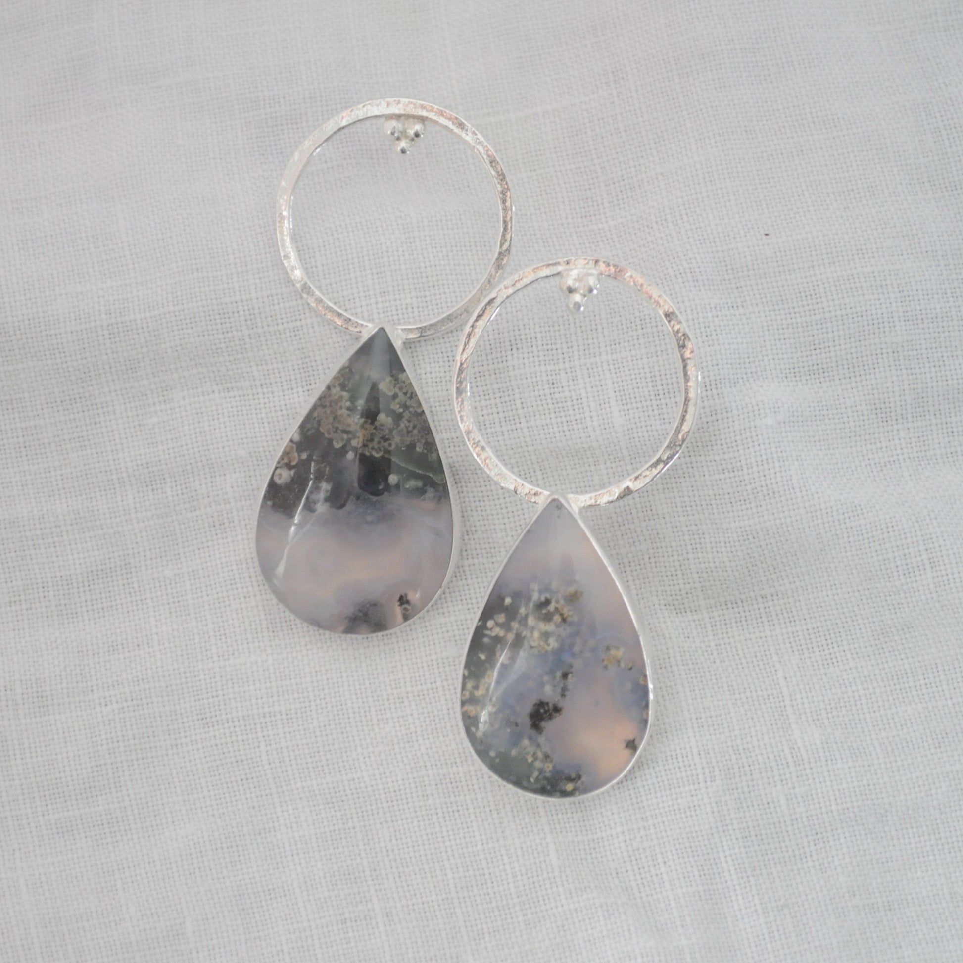 These moss agate chalcedony earrings are beautifully elegant featuring textured silver halos and ball embellishments. These stones have a subtle glow to them when the light hits.