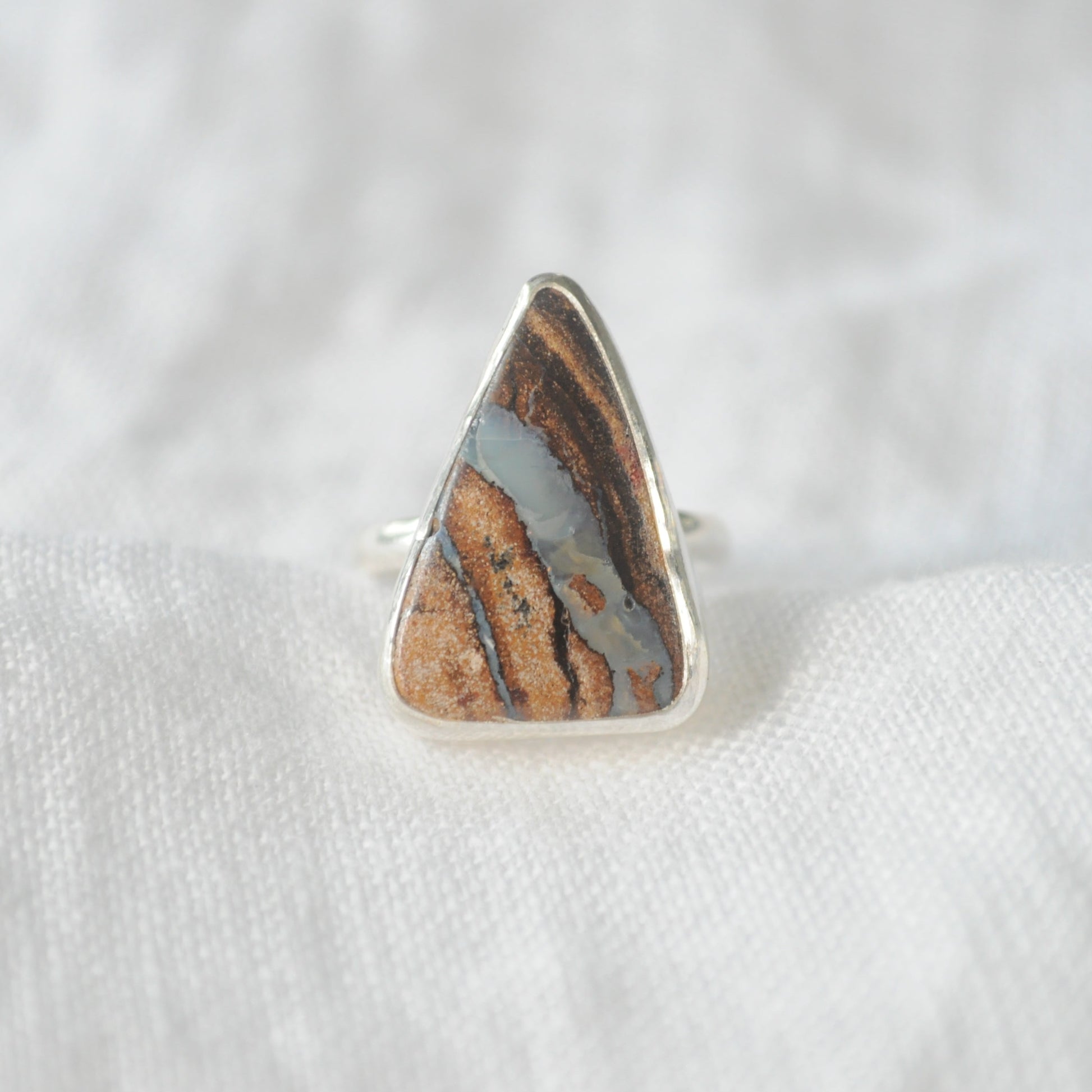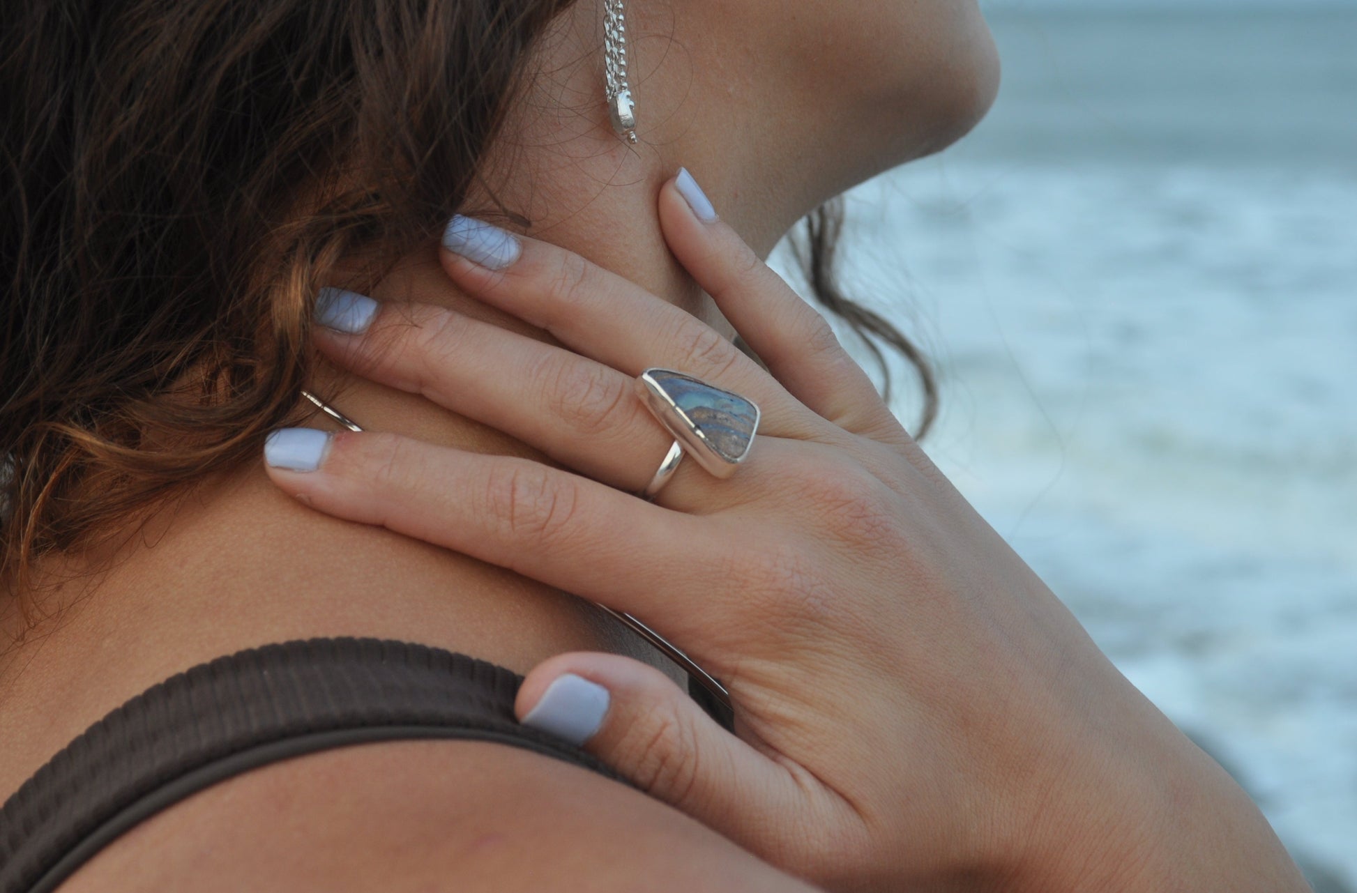 This size 5.75 ring is a colorless boulder opal. While mostly colorless, you can still see subtle flashes of orange opal within the "stream" of silica.